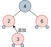 補足: 各パスの黒の数を揃えることになりますが、NULLについては実際のところ勘定に入れる必要はないです。木の操作を考える場合、NULLを黒とみなすと都合がよいです。図では、小さな黒丸で表しています。 - 規則 4: 赤の子は黒