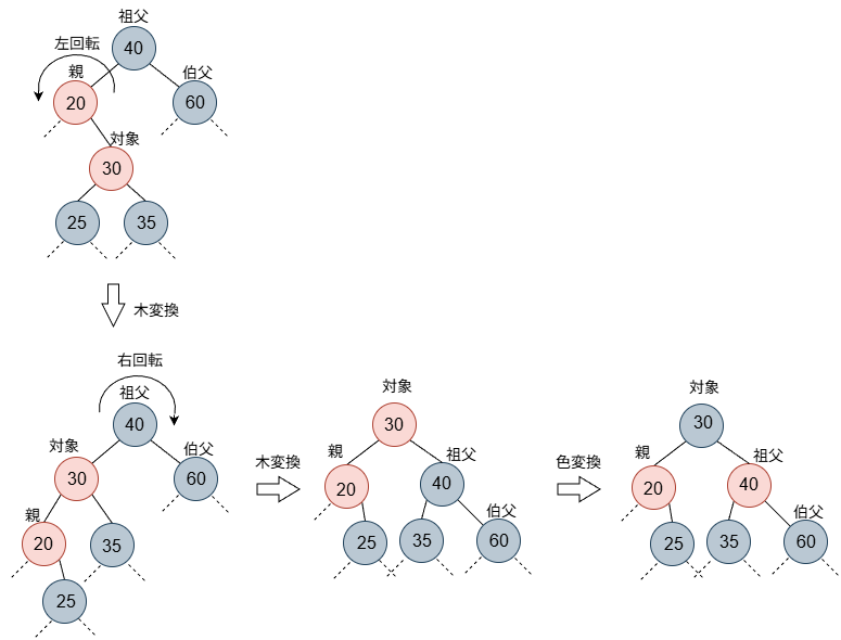 なお、本ブログの図では、色が赤か黒か不問の場合は、上図のように緑で表すことにします。また、木の操作のイメージが付きやすいように、具体的な数字例を入れていきます。